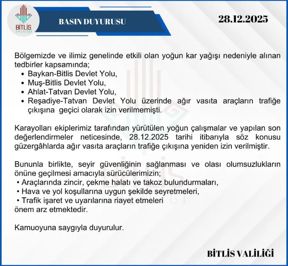 Bitlis Valiliği tarafından yapılan açıklamada, Baykan–Bitlis Devlet Yolu'nun, 28.12.2025 tarihi itibarıyla tır ve kamyon türü ağır vasıta araçların geçişine yeniden izin verildiği bildirildi.