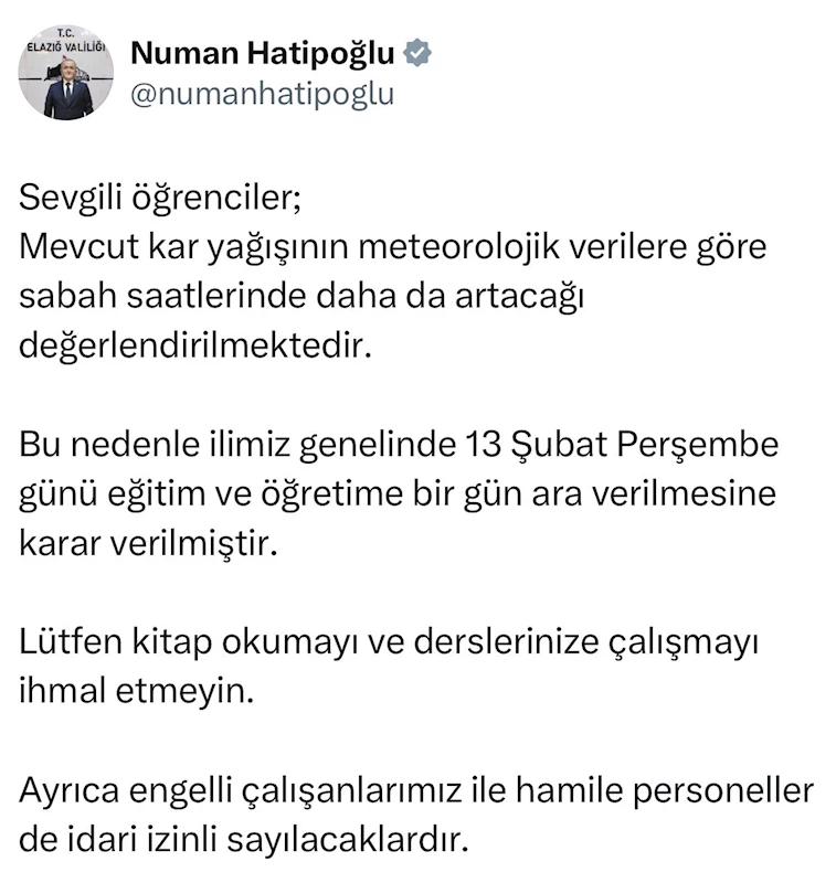 Elazığ Valisi Numan Hatipoğlu sosyal medya hesabından yaptığı açıklamada, "Mevcut kar yağışının meteorolojik verilere göre sabah saatlerinde daha da artacağı değerlendirilmektedir. Bu nedenle ilimiz genelinde 13 Şubat Perşembe günü eğitim ve öğretime bir gün ara verilmesine karar verilmiştir. Lütfen kitap okumayı ve derslerinize çalışmayı ihmal etmeyin. Ayrıca engelli çalışanlarımız ile hamile personeller de idari izinli sayılacaklardır" ifadelerini kullandı.