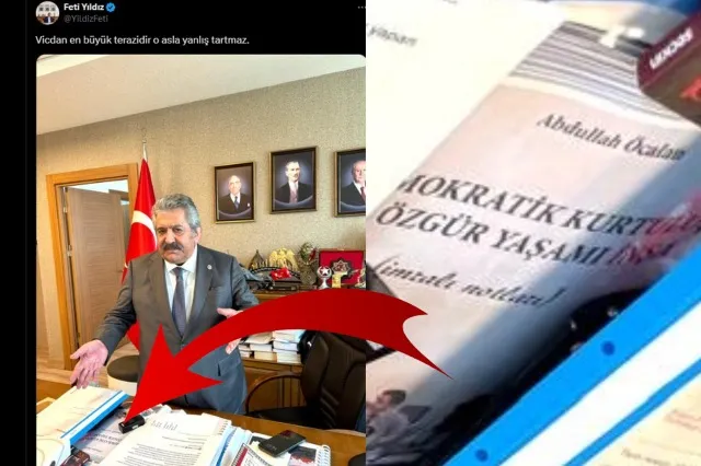 Yıldız'ın makam odasında çekilen karede, PKK elebaşı Abdullah Öcalan'a ait bir kitabın masada yer aldığı görüldü.