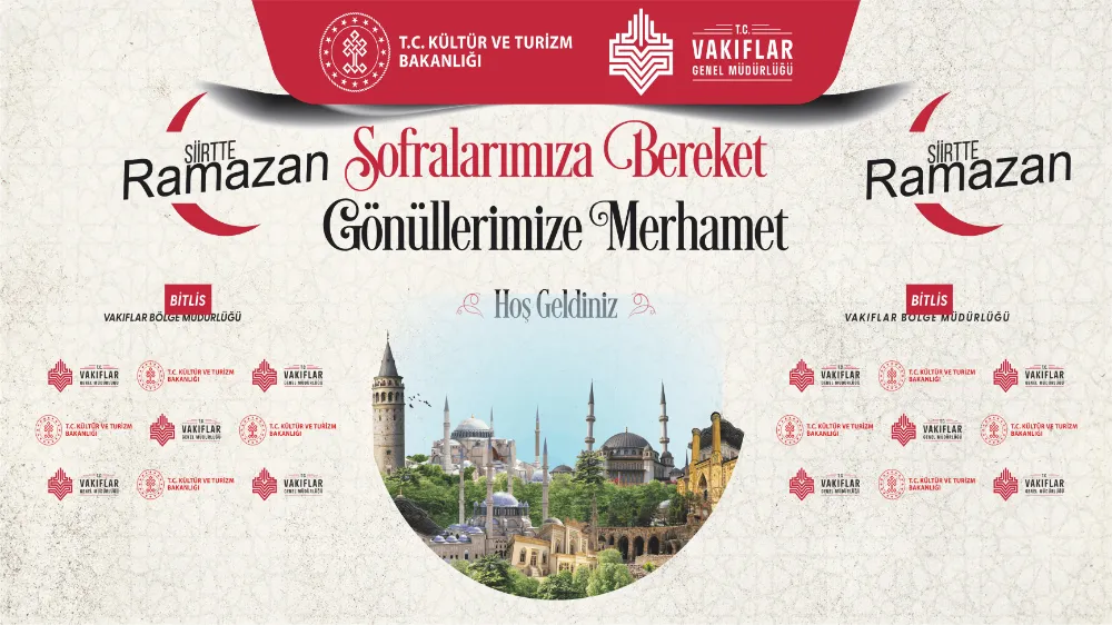 Bitlis Vakıflar Bölge müdürlüğü Ramazan Ayı Boyunca; Bitlis'te Grand Yeşilırmak Otel, İlimiz 'de ise, Siirt Merkezde Lokanta Osman ve Veysel Karani Beldesi'nde Öz Diyarbakır Sofrasında ve bölgenin diğer illerinde iftar sofraları kuracak.