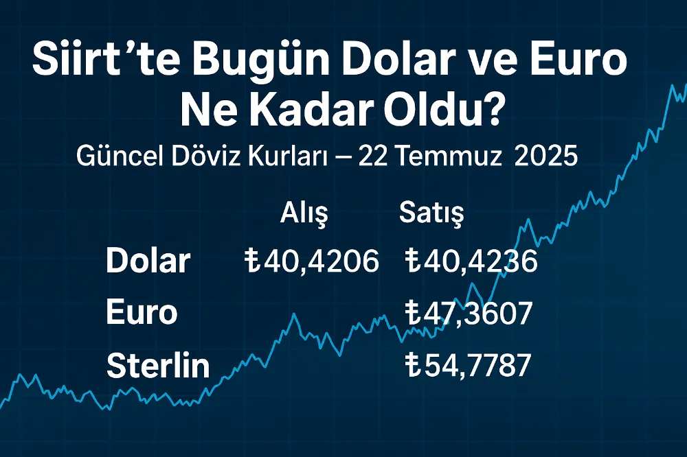 22 Temmuz 2025 Salı günü itibarıyla Siirt'te döviz kurları güncellendi. Dolar ve Euro kurunda hafif yükseliş gözlenirken, piyasalarda temkinli bir hareketlilik sürüyor.