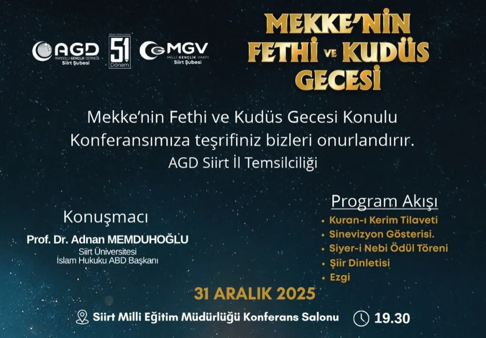 Siirt'te, İslam tarihinin dönüm noktalarından biri olan Mekke'nin Fethi ile Kudüs bilincini birlikte ele alan anlamlı bir program düzenleniyor. Anadolu Gençlik Derneği (AGD) Siirt İl Temsilciliği öncülüğünde, Milli Gençlik Vakfı (MGV) Siirt Şubesi iş birliğiyle gerçekleştirilecek olan "Mekke'nin Fethi ve Kudüs Gecesi", 31 Aralık 2025 Salı günü Siirtli vatandaşlarla buluşacak.