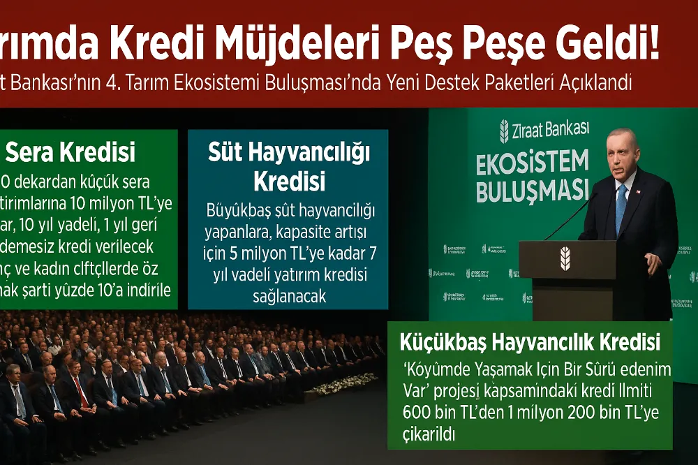 Cumhurbaşkanı Erdoğan, çiftçilere yönelik sera, hayvancılık ve küçükbaş üretim kredilerinde üst limitleri artırdı. Genç ve kadın üreticilere özel avantajlar getirildi.