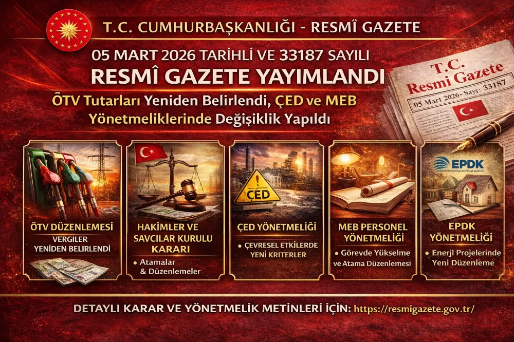05 Mart 2026 tarihli ve 33187 sayılı Resmî Gazete yayımlandı. Yürütme ve İdare Bölümü’nde Cumhurbaşkanı kararı ile bazı ürünlerde Özel Tüketim Vergisi (ÖTV) tutarları yeniden belirlenirken, çevre, eğitim ve enerji alanlarını ilgilendiren yönetmelik değişiklikleri yürürlüğe girdi.