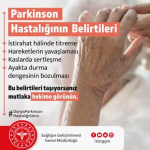 Sağlığın Geliştirilmesi Genel Müdürlüğü, 11 Nisan Dünya Parkinson Günü dolayısıyla yaptığı açıklamada, hastalığın sıklığı yaş ile birlikte arttığından, yaşlı nüfusun fazla olduğu ülkelerde hastalığın görülme oranının da arttığını belirterek,” Parkisnson hastalığının belirtilerini İstirahat halinde titreme, Hareket yavaşlaması, kaslarda sertleşme, ayakta durma dengesini bozulması. Bu belirtileri taşıyorsanız mutlaka hekime görünün”. Açıklamaları yapıldı
