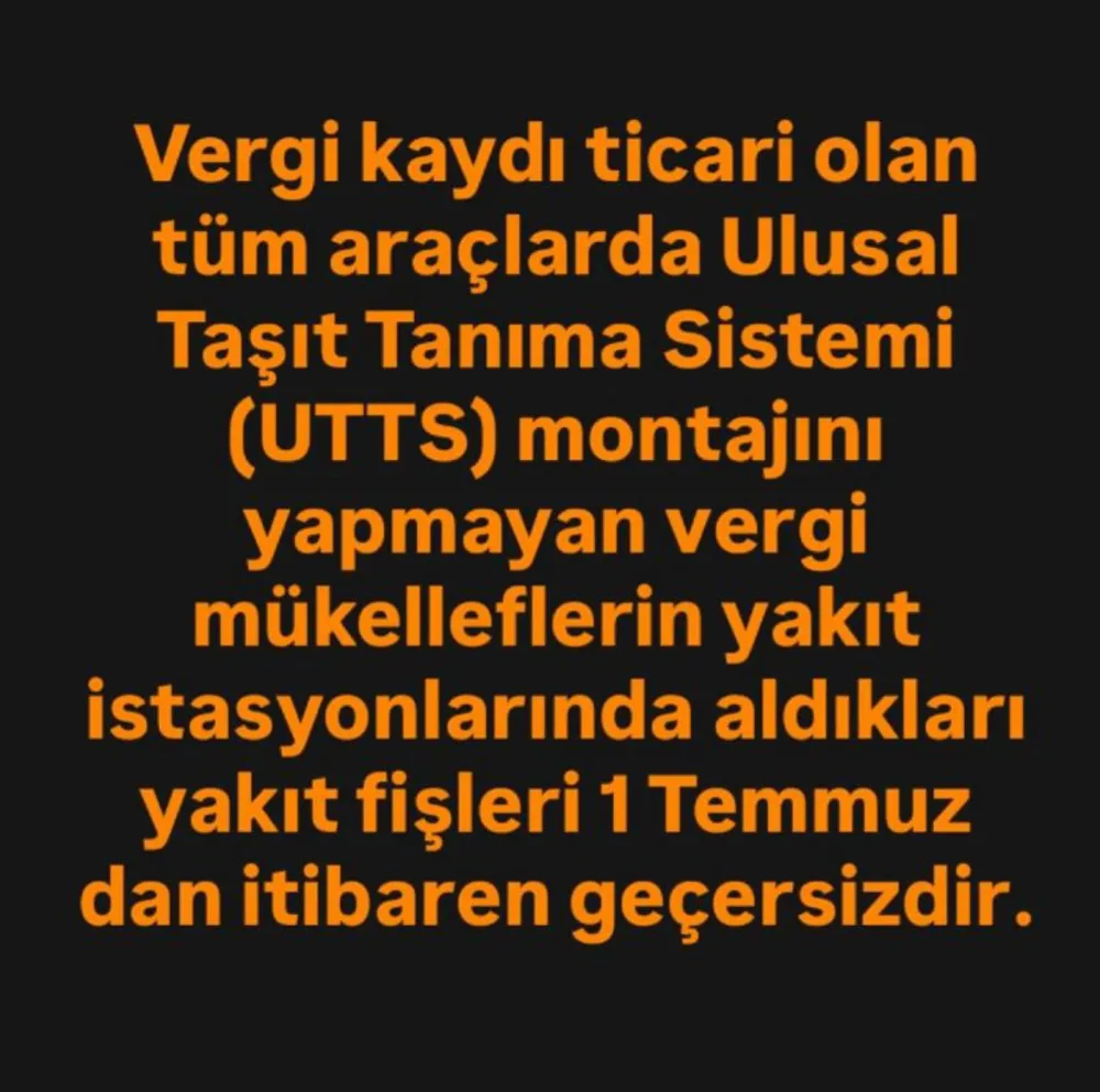 Vergi mükellefi olan ticari araç sahiplerinin, araçlarına Ulusal Taşıt Tanıma Sistemi (UTTS) cihazı taktırmamaları halinde, akaryakıt istasyonlarından alacakları fiş ve faturalar vergi indirimi ve gider kaydı açısından artık geçerli olmayacak.