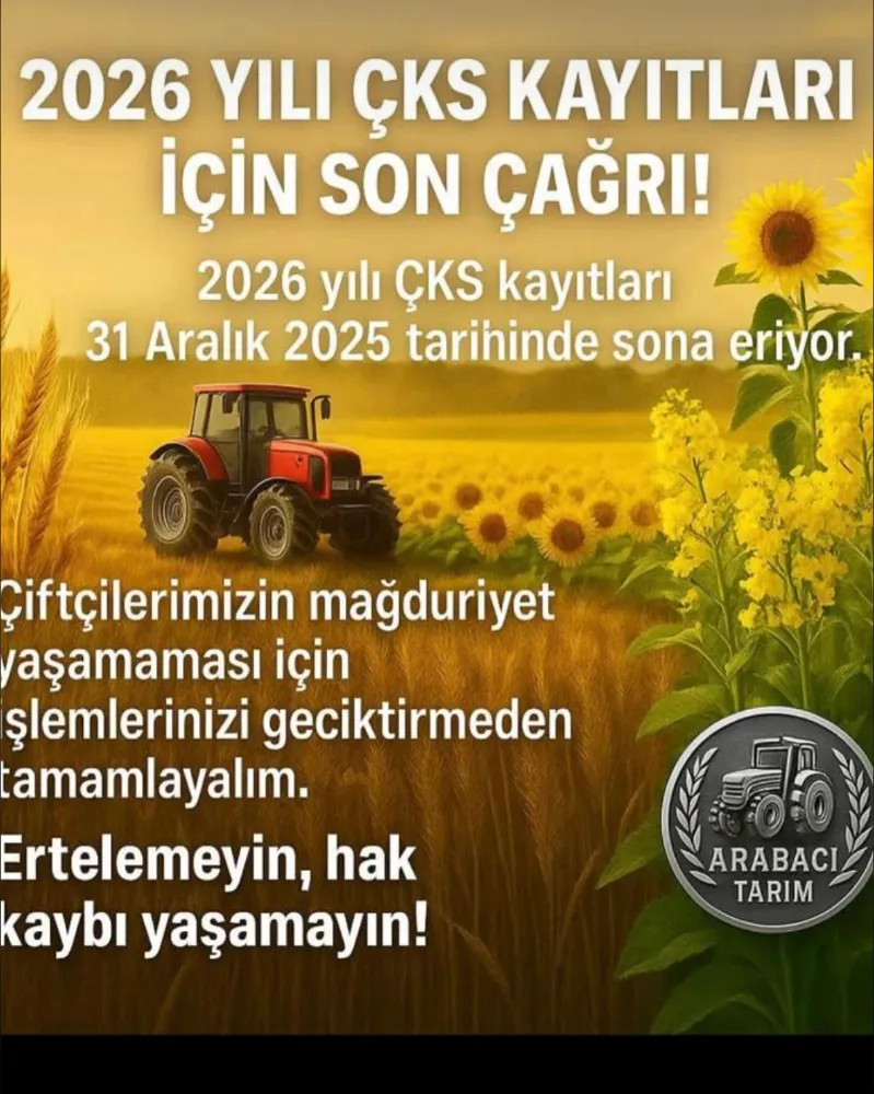 2026 yılı Çiftçi Kayıt Sistemi (ÇKS) başvuruları için geri sayım başladı. Tarımsal desteklerden yararlanmak isteyen üreticilerin kayıtlarını güncellemesi gereken süreç, 31 Aralık 2025 tarihinde sona erecek. Arabacı Tarım tarafından yapılan bilgilendirmede, çiftçilerin mağduriyet yaşamaması adına işlemlerin son güne bırakılmaması gerektiği vurgulandı.
