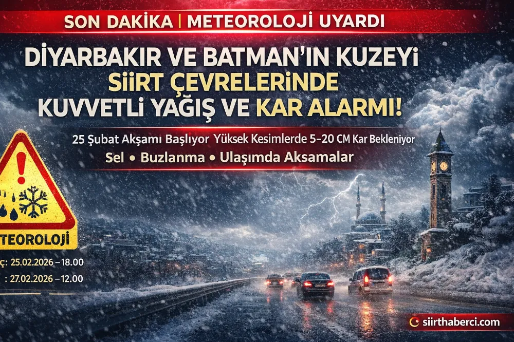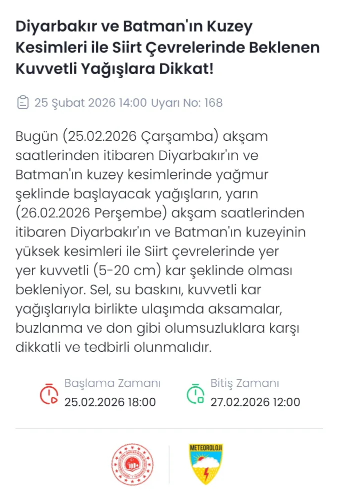 Yapılan açıklamaya göre; bugün (25 Şubat 2026 Çarşamba) akşam saatlerinden itibaren Diyarbakır ve Batman’ın kuzey kesimlerinde yağmur şeklinde başlayacak olan yağışların, yarın (26 Şubat 2026 Perşembe) akşam saatlerinden itibaren yüksek kesimlerde ve Siirt çevrelerinde kar yağışına dönüşmesi bekleniyor. Özellikle yüksek rakımlı bölgelerde 5 ila 20 santimetre arasında kar örtüsü oluşabileceği tahmin ediliyor.