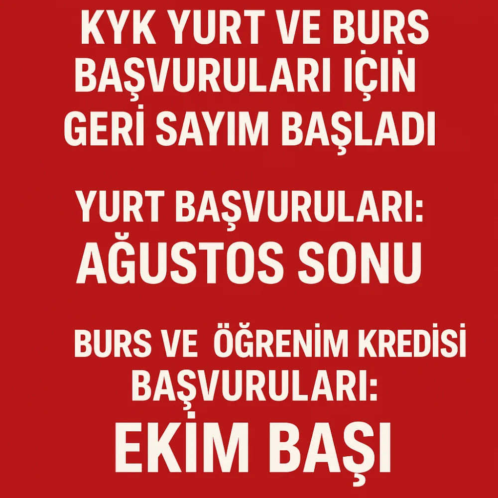 KYK burs ve kredi başvuruları ise geleneksel olarak Ekim ayı başında açılıyor. Bu yıl da 8–13 Ekim aralığında başvuruların alınması öngörülüyor.