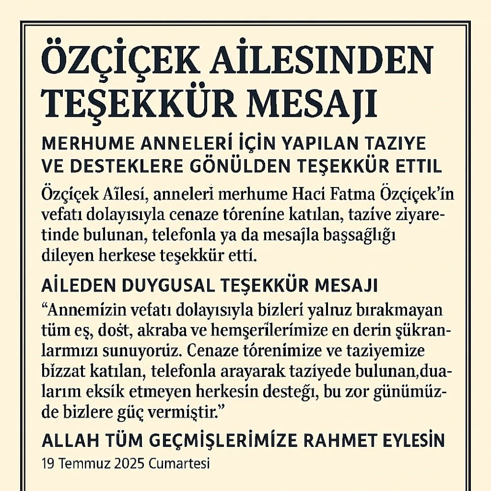 Özçiçek Ailesi, anneleri merhume Hacı Bekir Özçiçek’in vefatı dolayısıyla cenaze törenine katılan, taziye ziyaretinde bulunan, telefonla ya da mesajla başsağlığı dileyen herkese teşekkür etti.