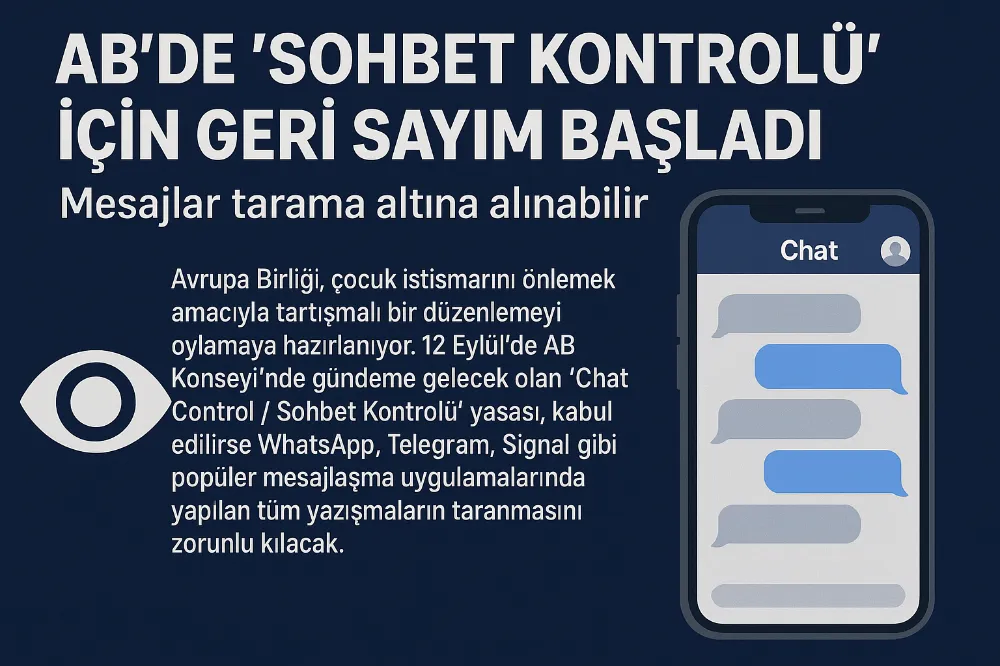 Avrupa Birliği, çocuk istismarını önlemek amacıyla tartışmalı bir düzenlemeyi oylamaya hazırlanıyor. 12 Eylül’de AB Konseyi’nde gündeme gelecek olan “Chat Control / Sohbet Kontrolü” yasası, kabul edilirse WhatsApp, Telegram, Signal gibi popüler mesajlaşma uygulamalarında yapılan tüm yazışmaların taranmasını zorunlu kılacak.