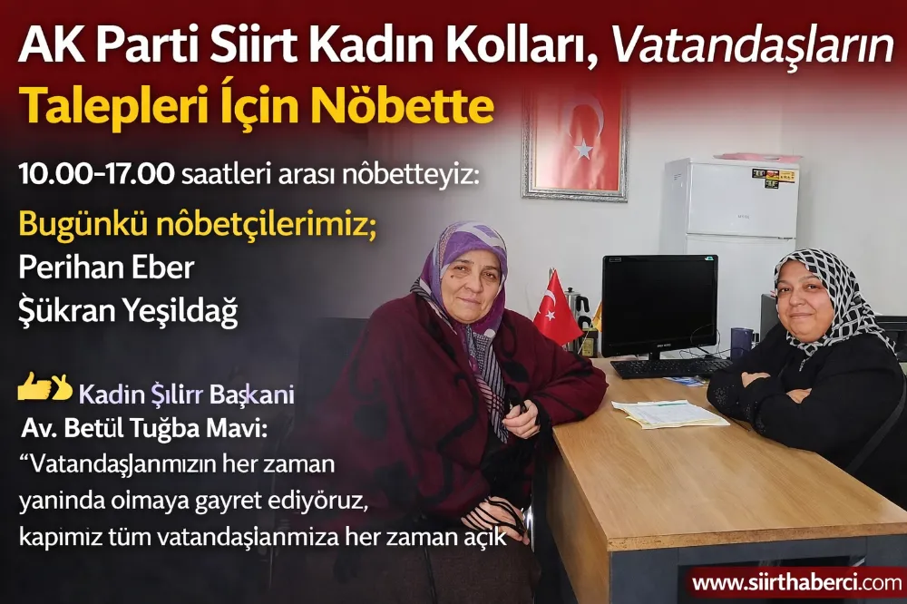 AK Parti Siirt Kadın Kolları tarafından yürütülen nöbet uygulamasında bugün görev alan isimler Perihan Eber ve Şükran Yeşildağ oldu. Gün boyunca parti binasında vatandaşları karşılayan nöbetçi üyeler, gelen talepleri dinleyerek gerekli notları aldı.