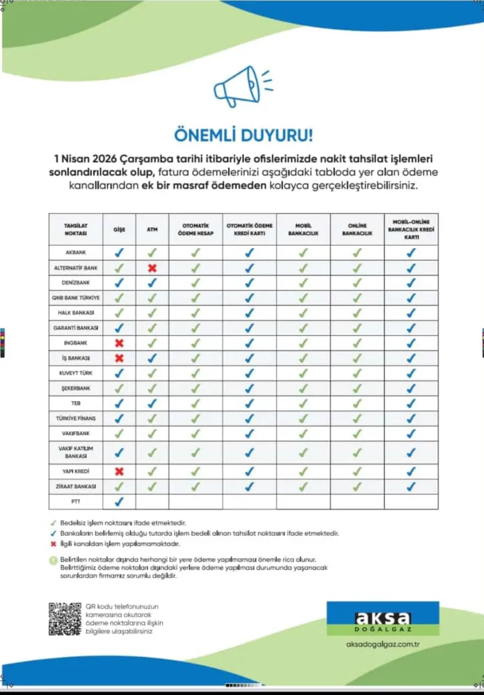 Aksa Doğalgaz, 1 Nisan 2026 Çarşamba tarihi itibarıyla ofislerinde nakit tahsilat işlemlerinin sonlandırılacağını duyurdu. Yapılan açıklamaya göre aboneler, fatura ödemelerini artık alternatif ödeme kanalları üzerinden gerçekleştirebilecek.