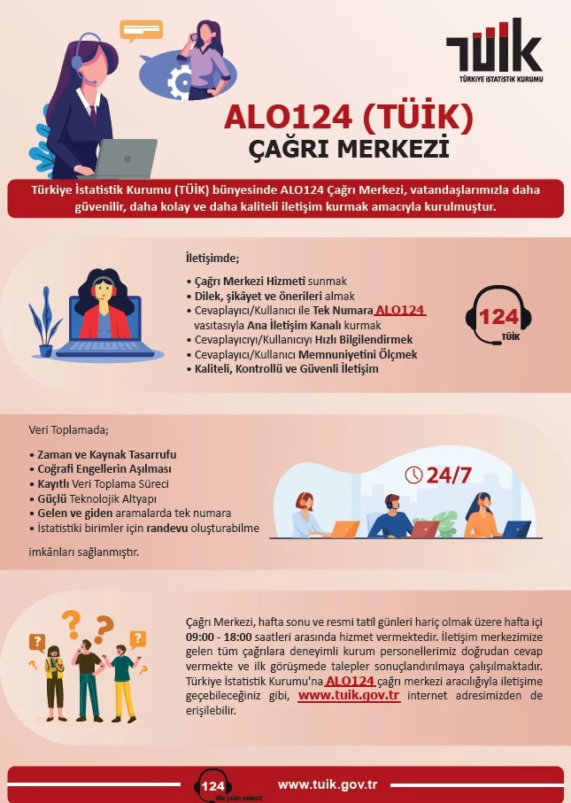 TÜİK Alo 124 çağrı merkezi, hafta sonu ve resmi tatil günleri hariç olmak üzere hafta içi 09:00 - 18:00 saatleri arasında hizmet vermektedir. İletişim merkezimize gelen tüm çağrılara deneyimli kurum personellerimiz doğrudan cevap vermekte ve ilk görüşmede talepler sonuçlandırılmaya çalışılmaktadır. Türkiye İstatistik Kurumu'na Alo 124 (TÜİK) çağrı merkezi aracılığıyla iletişime geçebileceğiniz gibi, www.tuik.gov.tr internet adresimizden de bize erişebilirsiniz.