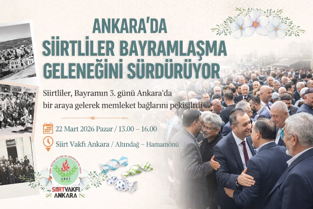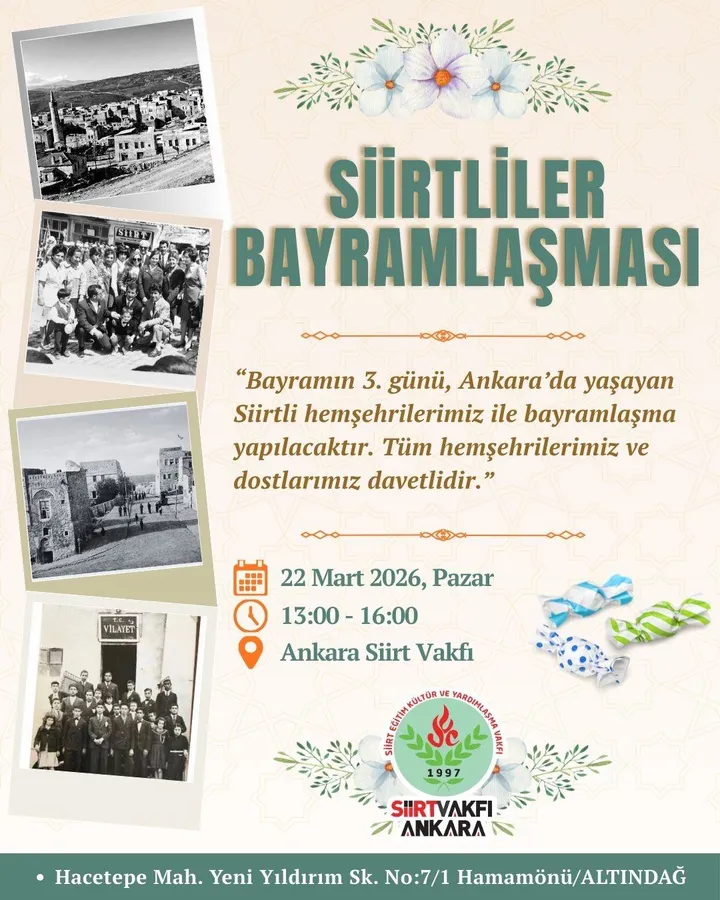 Etkinlik davetinde yer alan mesajda, “Bayramın 3. günü Ankara’da yaşayan Siirtli hemşehrilerimiz ile bayramlaşma yapılacaktır. Tüm hemşehrilerimiz ve dostlarımız davetlidir.” ifadelerine yer verildi.