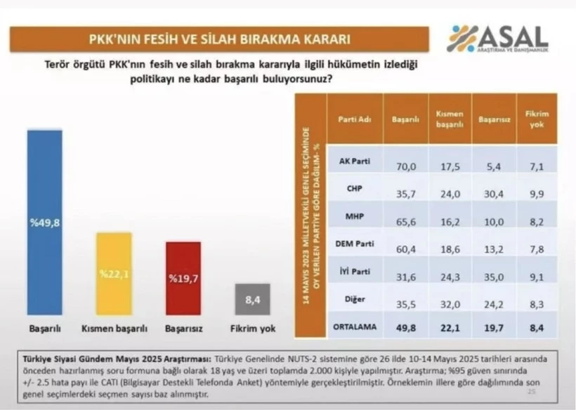 Ankette ayrıca, hükümetin PKK’nın fesih ve silah bırakma sürecinde izlediği politikanın başarısı da sorgulandı. Katılımcıların yüzde 49,8’i hükümetin bu konuda başarılı olduğunu düşünürken, yüzde 22,1’i kısmen başarılı buldu. Başarısız bulanların oranı yüzde 19,7, fikri olmayanların oranı ise yüzde 8,4 oldu.