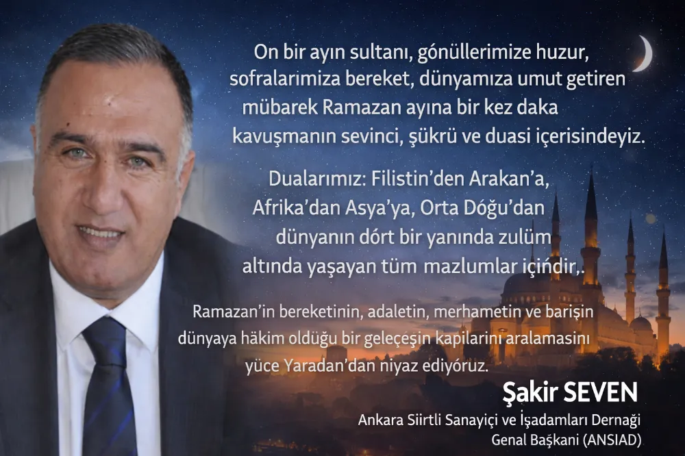 Ankara Siirt’li Sanayici ve İşadamları Derneği (ANSİAD) Genel Başkanı Şakir Seven, mübarek Ramazan ayı dolayısıyla yayımladığı kapsamlı mesajında; Ramazan’ın sadece bir oruç ayı değil, aynı zamanda arınma, dayanışma ve yeniden diriliş mevsimi olduğuna dikkat çekti.