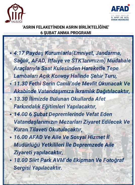 Türkiye tarihine “asrın felaketi” olarak geçen 6 Şubat 2023 depremlerinin yıl dönümünde, Siirt’te anlamlı ve kapsamlı bir anma programı düzenleniyor. Siirt Valiliği koordinesinde, AFAD başta olmak üzere ilgili tüm kamu kurumları, güvenlik birimleri ve sivil toplum kuruluşlarının katılımıyla gerçekleştirilecek program, “Asrın Felaketinden Asrın Birlikteliğine” temasıyla toplumsal dayanışmayı ve ortak hafızayı güçlendirmeyi amaçlıyor.