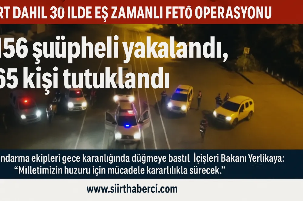 İçişleri Bakanı Ali Yerlikaya: “30 ilde Jandarmamız tarafından FETÖ’ye yönelik son iki haftada düzenlenen operasyonlarda 156 şüpheli yakalandı. Siirt’in de aralarında bulunduğu illerde yapılan operasyonlarda örgütün güncel yapılanmasına darbe vuruldu.”