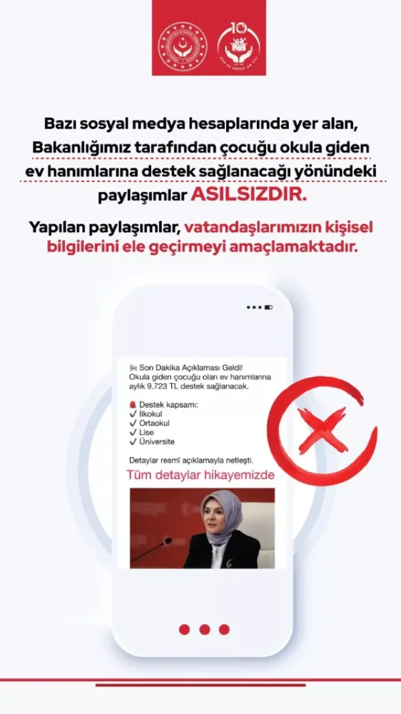 Bakanlığın doğrulanmış sosyal medya hesaplarından yapılan bilgilendirmede, bu tür paylaşımların aileler ve çocuklar üzerinden algı oluşturmayı hedeflediği, asıl amacın ise kimlik ve banka bilgilerini ele geçirmek olduğu vurgulandı.