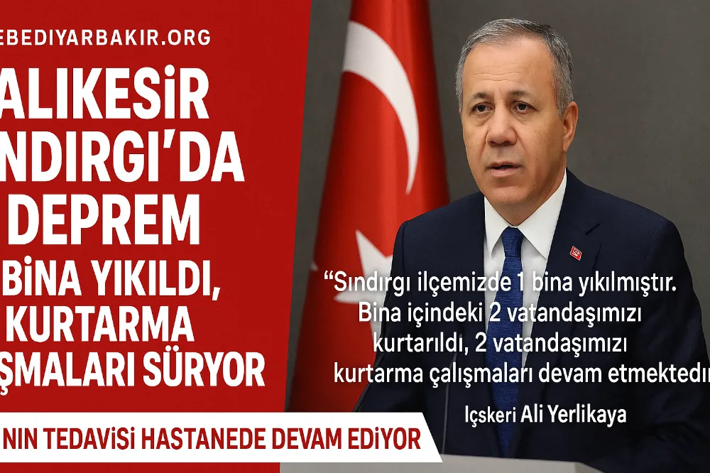 İçişleri Bakanı Ali Yerlikaya, depremden etkilenen bölgede 1 binanın yıkıldığını belirterek, “Bina içerisindeki 2 vatandaşımız kurtarıldı, 2 vatandaşımızı kurtarma çalışmaları devam etmektedir” dedi. Yerlikaya, AFAD ve ilgili tüm ekiplerin bölgede koordineli şekilde çalıştığını, vatandaşların güvenli alanlara yönlendirilmesi için gerekli tedbirlerin alındığını ifade etti.