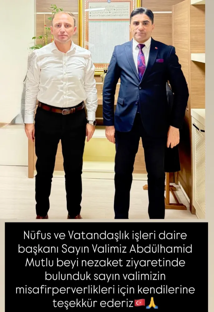 Gerçekleştirilen ziyaretler kapsamında, Nüfus ve Vatandaşlık İşleri Daire Başkanı, önceki dönem Siirt Vali yardımcısı Abdülhamid Mutlu,yu makamında ziyaret etti.