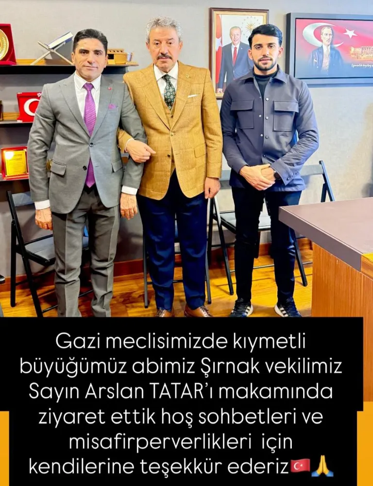 Ziyaret trafiğinin bir diğer önemli durağı ise Türkiye Büyük Millet Meclisi oldu. Şırnak Milletvekili Arslan Tatar makamında gerçekleştirilen ziyarette bölgeye dair güncel konular, beklentiler ve çözüm önerileri üzerine sohbet etti. Sıcak karşılaması ve ev sahipliği dolayısıyla kendisine teşekkür edildi.