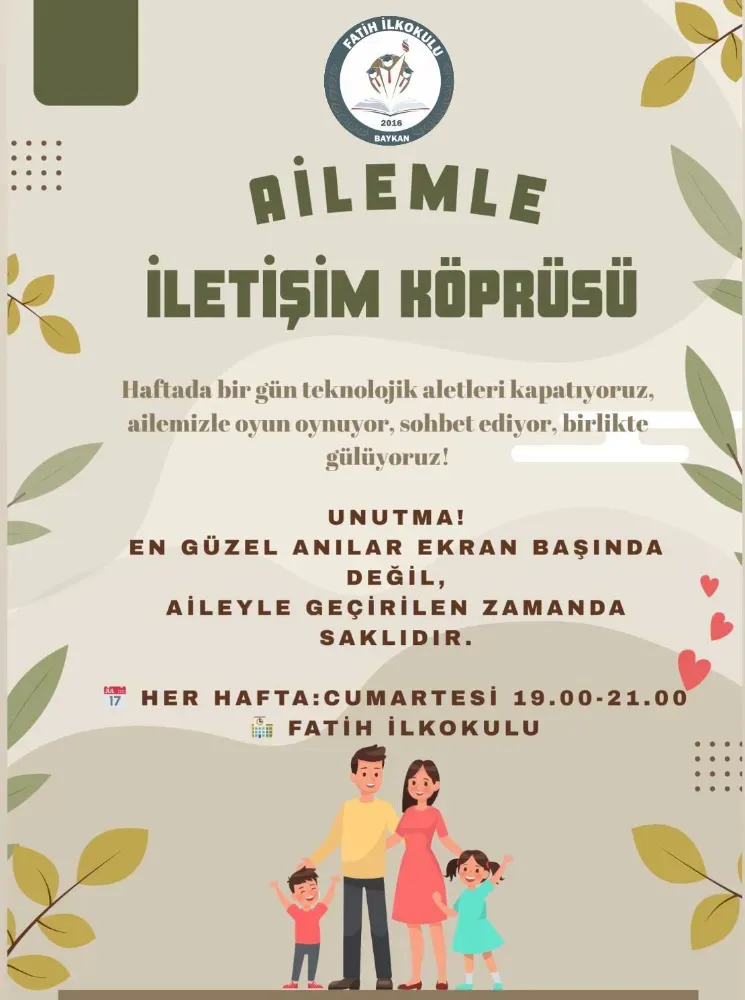 “Ailemle İletişim Köprüsü” adı verilen proje kapsamında, haftada bir gün teknolojik cihazlara ara verilerek çocukların aileleriyle yüz yüze iletişim kurmaları teşvik ediliyor.