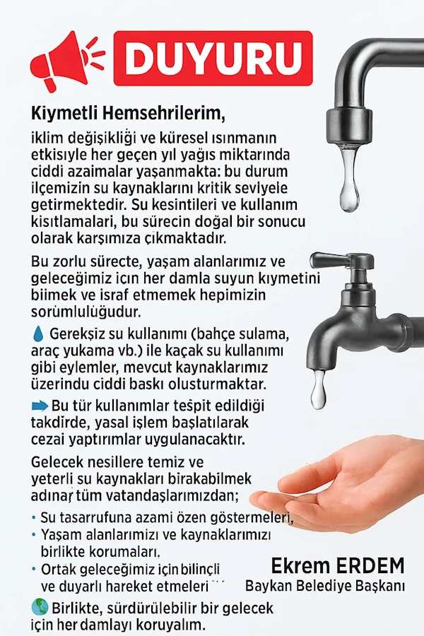 “İklim değişikliği ve küresel ısınmanın etkisiyle yağış miktarında ciddi azalmalar yaşanmakta; bu durum su kaynaklarımızı tehdit etmektedir. Su kesintileri ve kullanım kısıtlamaları bu sürecin doğal bir sonucudur. Yaşam alanlarımız ve geleceğimiz için her damla suyun kıymetini bilmek ve israf etmemek hepimizin sorumluluğudur.”