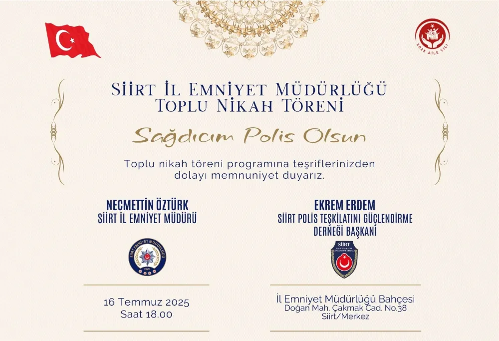 Etkinliğin ev sahipliğini Siirt İl Emniyet Müdürü Necmettin Öztürk ve Başkan Ekrem Erdem üstleniyor. “Sağdıcım Polis Olsun” mesajıyla düzenlenecek törende, evlilik yolundaki çiftlere hem manevi destek sunulacak hem de emniyet teşkilatının toplumla olan gönül bağı vurgulanacak.