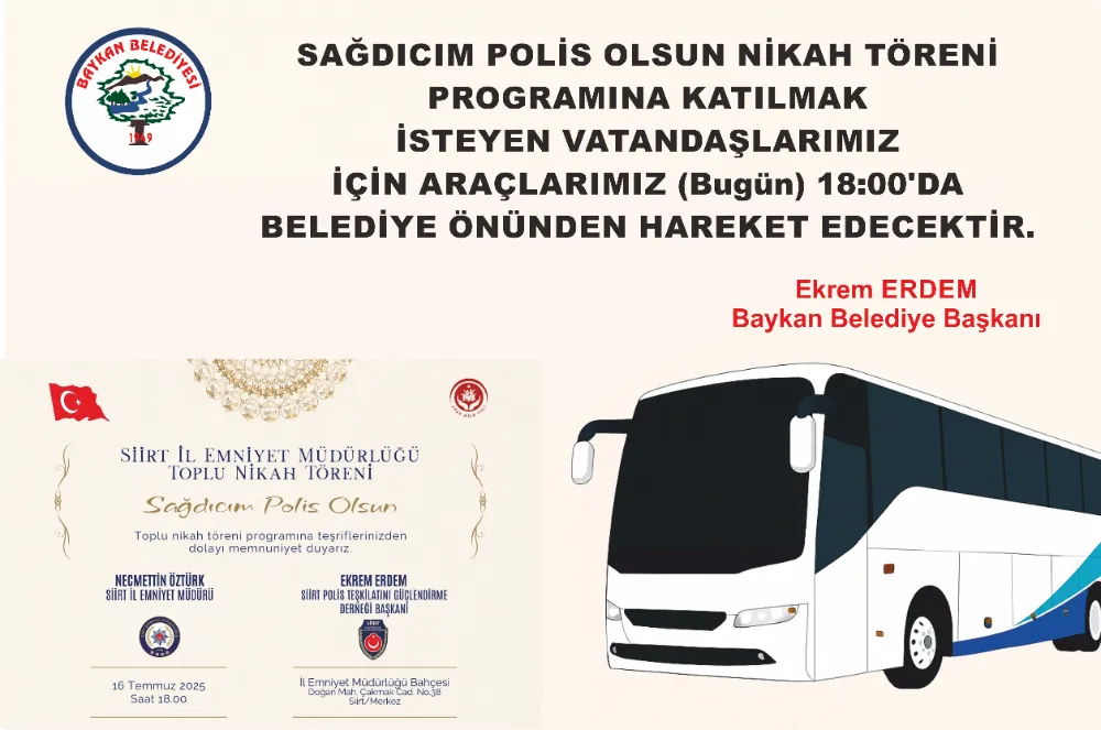 Siirt İl Emniyet Müdürlüğü tarafından 16 Temmuz 2025 Salı günü saat 18.00’de düzenlenecek olan “Sağdıcım Polis Olsun” temalı Toplu Nikâh Töreni için Baykan Belediyesi vatandaşlara ulaşım desteği sağlıyor.