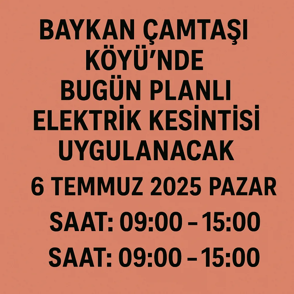 Dicle Elektrik Dağıtım A.Ş. (DEDAŞ) tarafından yapılan açıklamaya göre, Siirt’in Baykan ilçesine bağlı Çamtaşı Köyü'nde bugün (6 Temmuz 2025 Pazar) planlı elektrik kesintisi uygulanacak.