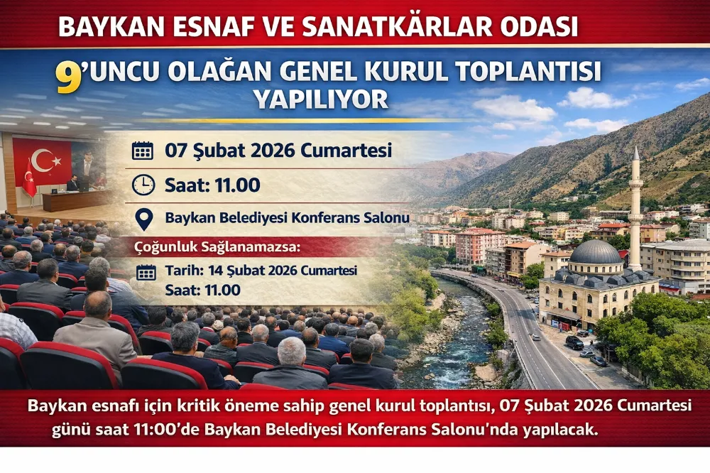 Baykan Esnaf ve Sanatkârlar Odası, 5362 sayılı Esnaf ve Sanatkârlar Meslek Kuruluşları Kanunu’nun 43’üncü maddesi kapsamında 9’uncu Olağan Genel Kurul Toplantısı için resmi ilanını yayımladı.
