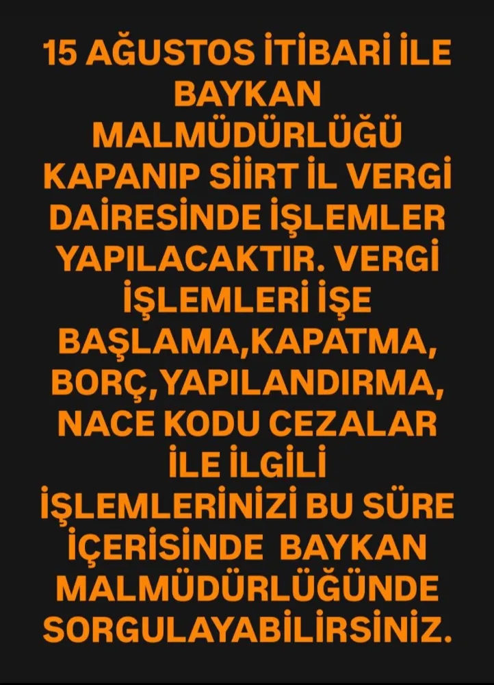 15 Ağustos 2025 tarihi itibarıyla Baykan Malmüdürlüğü kapanacak, tüm işlemler Siirt İl Vergi Dairesi üzerinden yürütülecek.