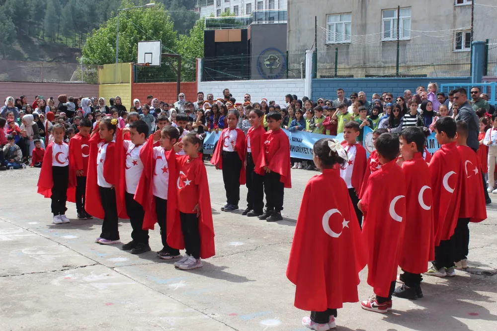 Bayraklar ve balonlarla süslenen okul bahçesinde düzenlenen etkinlikte çocuklar, hazırladıkları şiir, dans ve halk oyunları gösterileriyle izleyenlere unutulmaz anlar yaşattı.