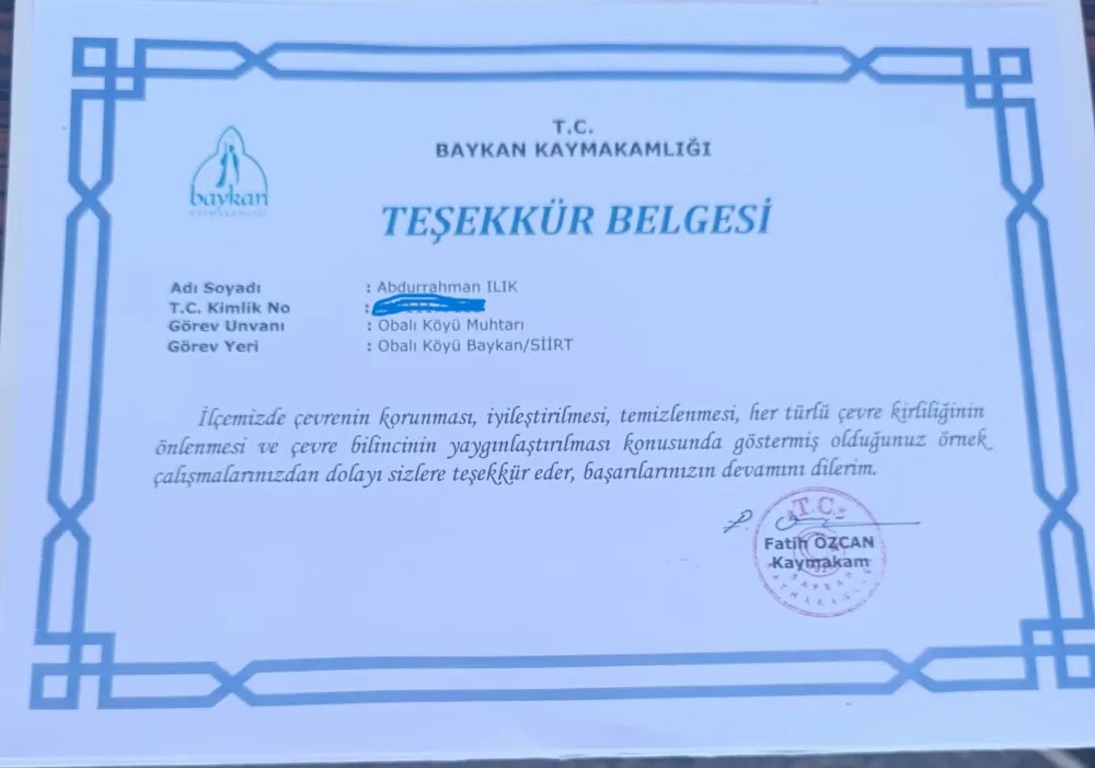 Baykan Kaymakamı Fatih Özcan , piknik yaptığı Kent Orman mesire alanında gönüllü olarak çevre temizliği yapan Obalı Köyü muhtarı Abdurrahman Ilık’ı teşekkür belgesi ile ödüllendirdi. Geçtiğimiz günlerde Baykan ilçesinde bulunan Kent Orman mesire alanında piknik yapan Obalı Köyü Muhtarı Abdurrahman Ilık, bölgede yaptığı temizlik ile gündeme gelmişti. Yapılan bu davranışa kayıtsız kalmayan Baykan Kaymakamı Fatih Özcan , imkânları doğrultusunda gönüllü olarak Baykan Kent Orman mesire alanında temizlik yapan, atıkları toplayan Obalı Köyü Muhtarı Abdurrahman Ilık’ a teşekkür belgesi takdim etti. Gerçekleştirilen doğa dostu Muhtar Ilık bu faaliyetten sonra Baykan Kaymakamı Fatih Özcan’ın daveti üzerine makamında ziyaret eden çevre dostu Muhtar Ilık , doğa adına gerçekleştirilen her faaliyete öncü olmaya hazır olduklarını ve vatandaşlarında çevre temizliği konusunda duyarlı olmasını vurguladı. Obalı Köyü Muhtarı Abdurrahman Ilık’ a bu davranışından dolayı ziyaret kapsamında teşekkür belgesi takdim eden Baykan Kaymakamı Fatih Özcan ise, çevre ve doğa konusunda yapılan her çalışmanın yanında olduklarını belirterek, bu duyarlı davranıştan dolayı Muhtar Ilık’ a teşekkür dileklerini iletti. NE OLMUŞTU HABERLERİN DETAYI İÇİN TIKLAYINIZ