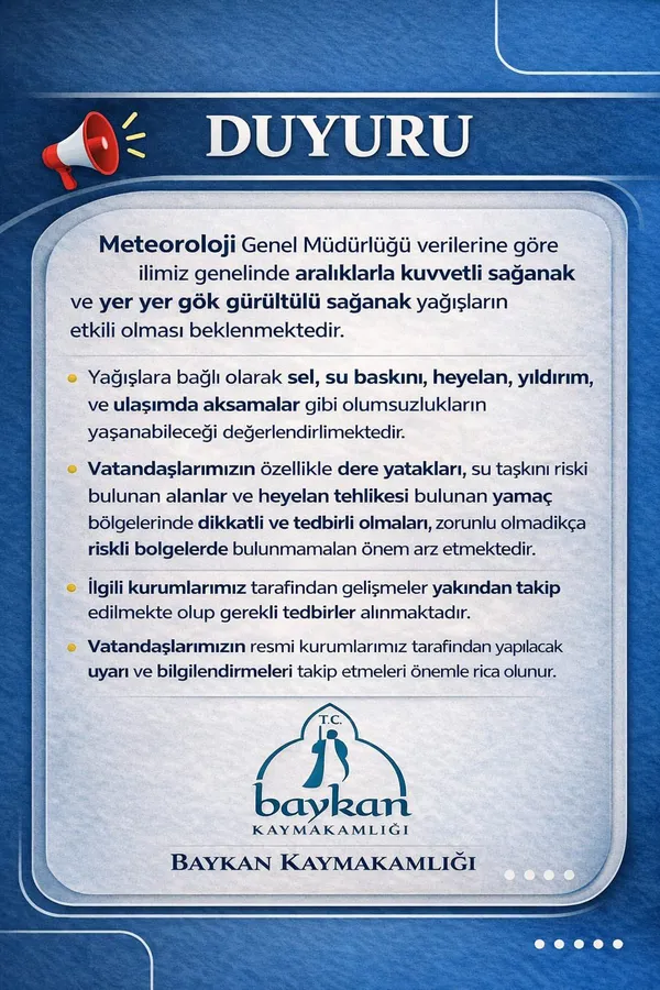 Baykan Kaymakamlığı tarafından yapılan meteorolojik değerlendirmede, yağışların özellikle bazı bölgelerde ciddi riskler oluşturabileceği belirtilerek vatandaşların tedbirli davranmaları istendi.