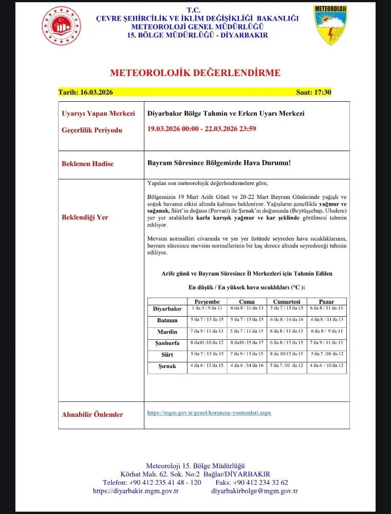 Meteoroloji’den Kritik Uyarı: Bayram Günlerinde Sıcaklık Düşüyor, Kar Sürprizi Kapıda Meteoroloji Genel Müdürlüğü 15. Bölge Müdürlüğü tarafından yapılan son değerlendirmelere göre, Güneydoğu Anadolu Bölgesi’nde bayram süresince etkili olacak hava koşulları vatandaşları yakından ilgilendiriyor.