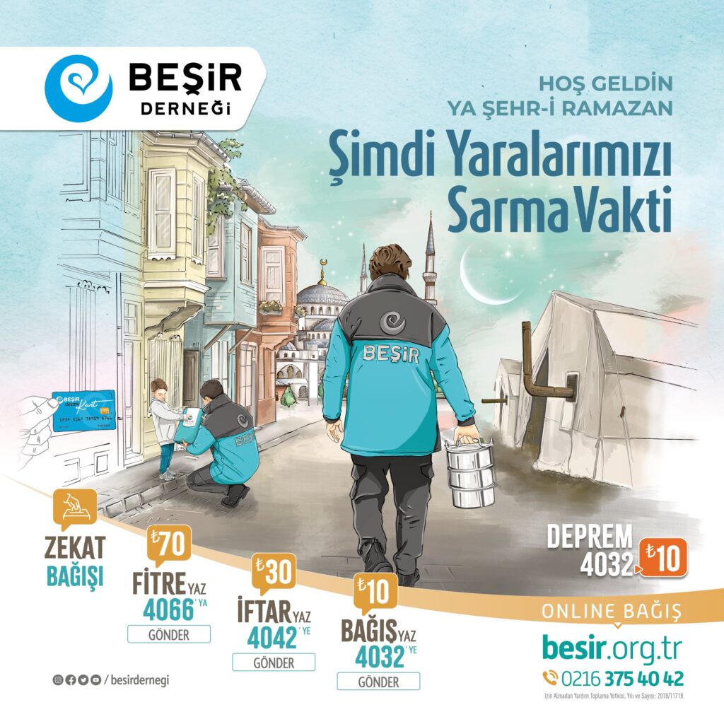 Deprem bölgesindeki halkına yardım etmek için kampanya da başlatan Beşir Derneği, tüm kamuoyuna dayanışma çağrısında bulundu. Dernek, Ramazan süresince de her gün iftar sofrası kuracak ve gıda paketleri dağıtacak. Bu sofraya ortak olmak isteyen herkes bagis.besir.org.tr web sayfası üzerinden dilediği miktarda online bağışta bulunabiliyor.