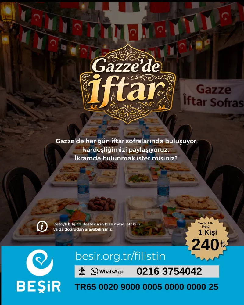 Beşir Derneği tarafından yapılan çağrıda, “Gazze’de her gün iftar sofralarında buluşuyor, kardeşliğimizi paylaşıyoruz. İmkânın varsa daha fazla kişiye umut olabilirsin” ifadelerine yer verildi.