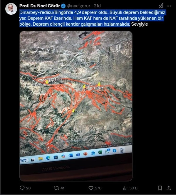 Prof. Dr. Naci Görür, sosyal medya üzerinden yaptığı paylaşımda, “Dinarbey-Yedisu/Bingöl’de 4,9 deprem oldu. Büyük deprem beklediğimiz yer. Deprem KAF üzerinde. Hem KAF hem de NAF tarafında yüklenen bir bölge. Deprem dirençli kentler çalışmaları hızlanmalıdır" ifadelerini kullandı.