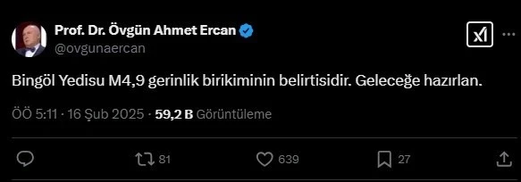Öte yandan Prof. Dr. Övgün Ahmet Ercan da sosyal medya hesabından, "Bingöl Yedisu M4,9 gerinlik birikiminin belirtisidir. Geleceğe hazırlan" sözleriyle bölgedeki tehlikeye işaret etti.