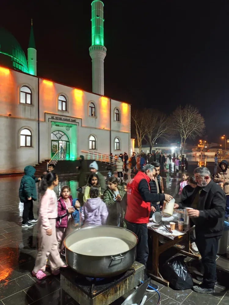 Mübarek gecede camilere gelen vatandaşlara salep ikramında bulunularak paylaşma ve kardeşlik ruhu yaşatıldı.