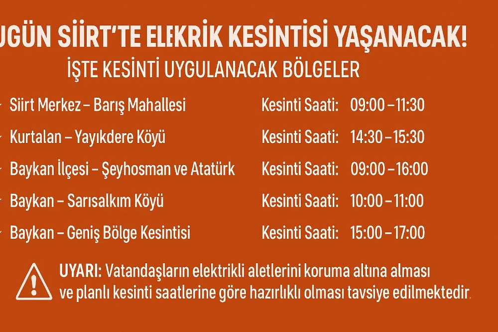 Baykan – Geniş Bölge Kesintisi Etki Alanı: Şeyhosman, Atatürk, Sarısalkım, Çelikli, Dedebakırı, Gümüşkaş, Çay, Tütenocak, Aşağı Tütenocak, Ardıçdalı, Meşelik, Çukurtaş, Eğridere, Atabağı Kesinti Saati: 15:00 – 17:00