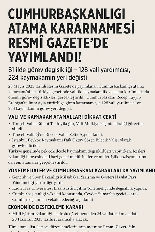 28 Mayıs 2025 tarihli Resmî Gazete’de yayımlanan Cumhurbaşkanlığı atama kararnamesi ile Türkiye genelinde valilik, kaymakamlık ve kamu kurumlarında önemli görev değişiklikleri gerçekleştirildi. Cumhurbaşkanı Recep Tayyip Erdoğan’ın imzasıyla yürürlüğe giren kararnameyle 128 vali yardımcısı ve 224 kaymakamın görev yeri değişti.
