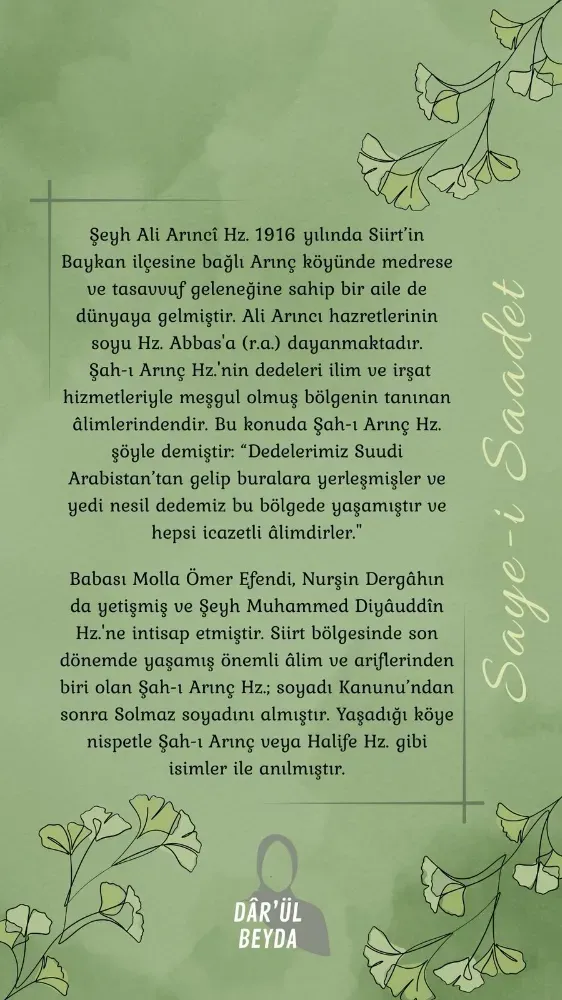 Paylaşımlarda yer alan bilgilere göre Şeyh Ali Arıncî Hazretleri, 1916 yılında Siirt’in Baykan ilçesine bağlı Arınç köyünde, medrese ve tasavvuf geleneğine sahip bir ailede dünyaya geldi.