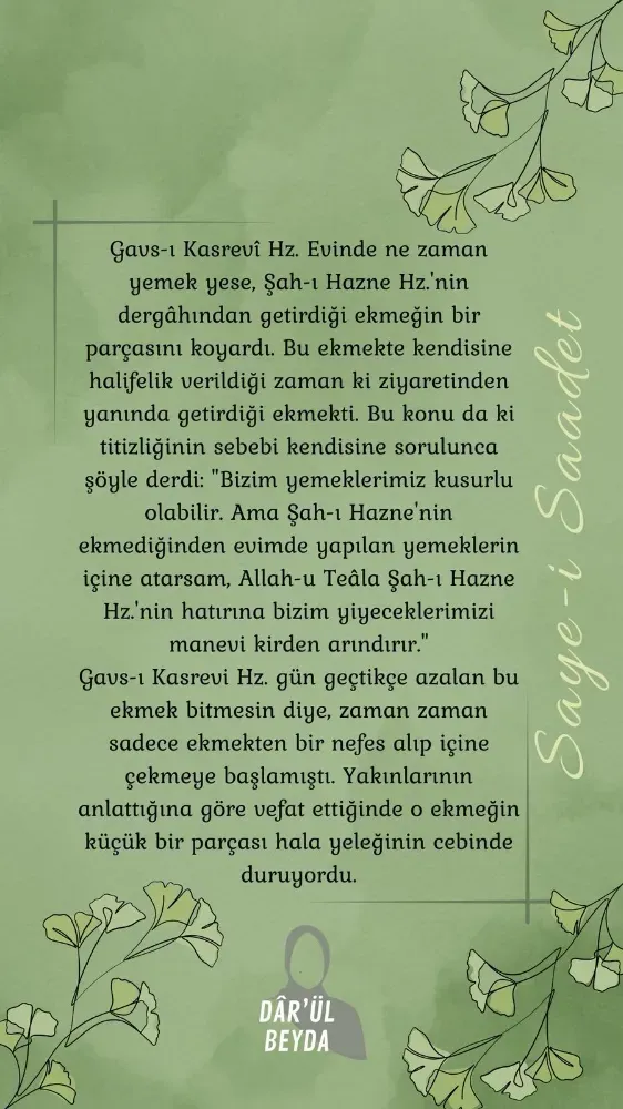 Paylaşımların en dikkat çekici bölümlerinden birinde ise Gavs-ı Kasrevî Hazretleri’nin, Şah-ı Hazne dergâhından getirdiği ekmeği büyük bir hürmetle sakladığına ilişkin rivayet aktarıldı. Metinde, bu ekmeğin evdeki yiyeceklere manevi bereket vesilesi olması niyetiyle muhafaza edildiği ifade edildi.