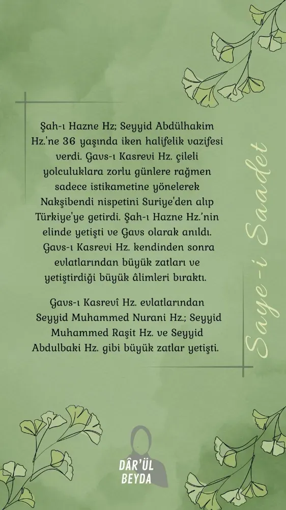 Paylaşımlara göre Şah-ı Hazne Hazretleri, Seyyid Abdülhakim Hazretleri’ne 36 yaşında halifelik vazifesi verdi. İçerikte, onun sadece kendi döneminde değil, kendisinden sonra bıraktığı evlatları ve yetiştirdiği âlimlerle de etkisini sürdürdüğü anlatıldı.