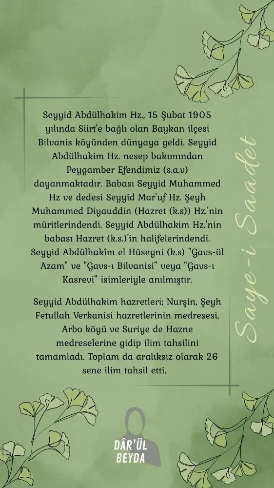 Görsellerde yer alan bir başka bölümde ise Seyyid Abdülhakim Hazretleri’nin hayatına ilişkin bilgiler paylaşıldı. Buna göre, 15 Şubat 1905 tarihinde Siirt’e bağlı Baykan ilçesinin Bilvanis köyünde dünyaya gelen Seyyid Abdülhakim Hazretleri’nin, nesep bakımından Peygamber Efendimiz’e dayandığı ifade edildi.