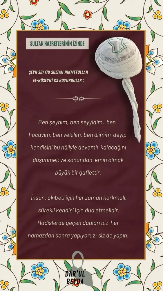Paylaşılan son görsellerden birinde ise Şeyh Seyyid Sultan Hikmetullah El-Hüseynî Hazretleri’ne atfedilen sözlere yer verildi. Metinde; kişinin kendi makamına, ilmine, vekilliğine ya da seyyidliğine güvenerek akıbetinden emin olmasının büyük bir gaflet olduğu vurgulandı.